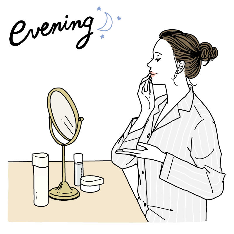 美容のプロの“夜のスキンケア”は、入浴時からスタート。湯船につかりながら、首からデコルテにかけて老廃物を流すマッサージをして、スキンケアが浸透しやすい状態を作ります。血行不良は肌機能が低下する要因になることから、シャワーだけで済まさずに、湯船につかるようにしましょう。