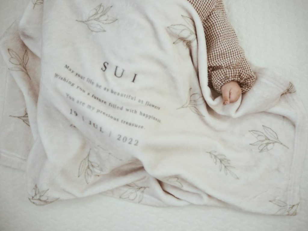 子どもをあたたかくふんわりと包んでくれるブランケット。名入れでオーダーできるのでプレゼントにぴったりです。生年月日もプリントしてもらえます。特別なプレゼントが残っているのは、大きくなってからも喜んでもらえるはずです。