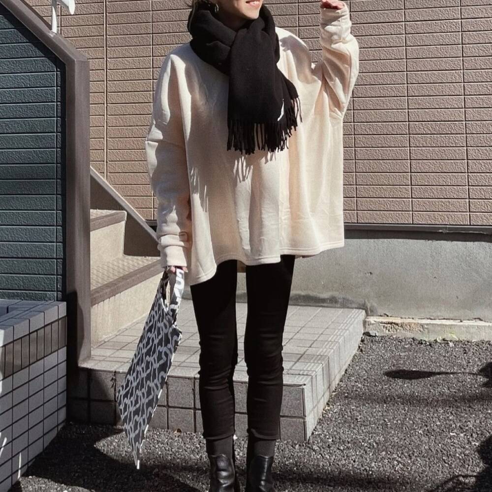 オーバーサイズのトップスを合わせる着こなしは、ゆる×ピタのバランスが絶妙で、太って見えないのが◎