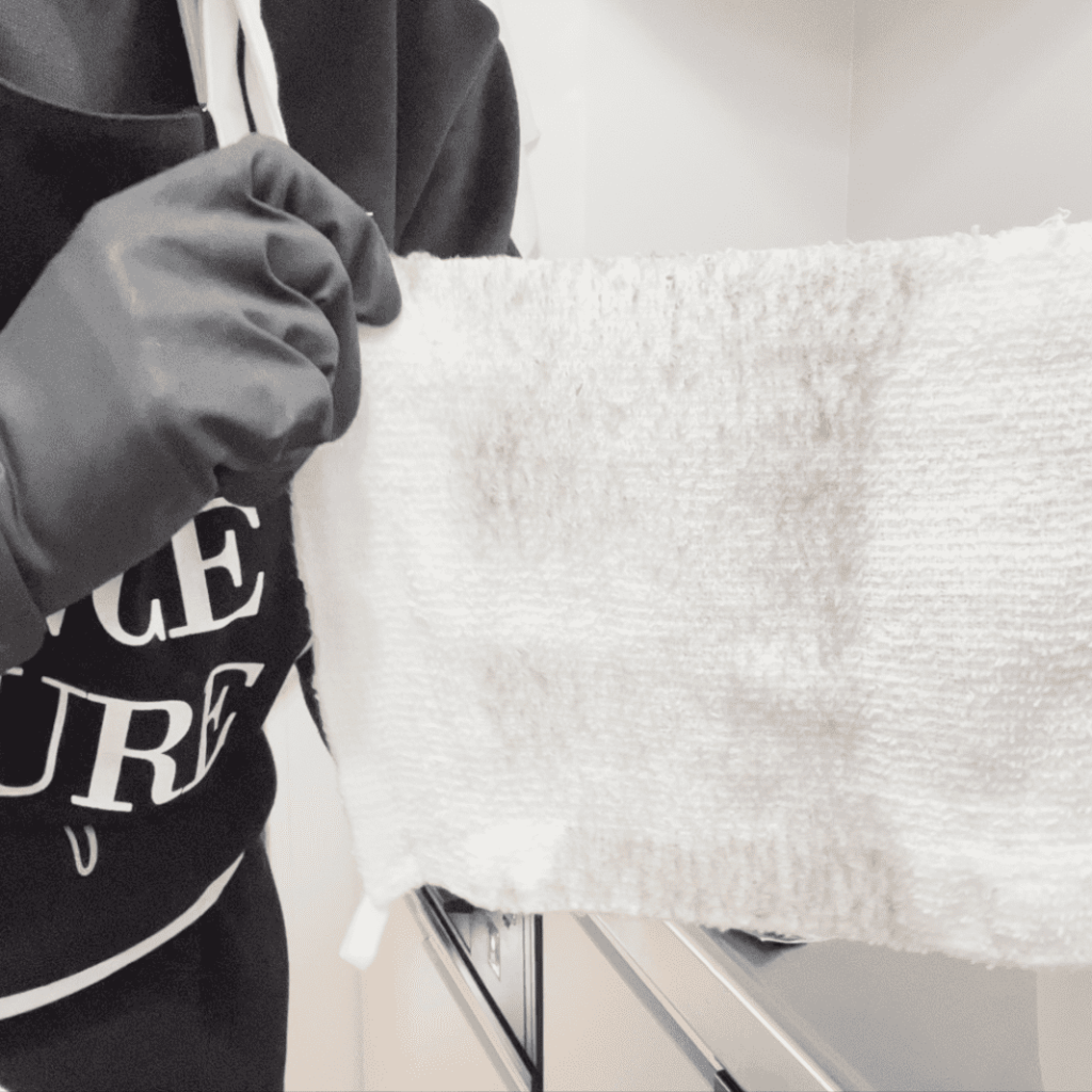 もともと真っ白だったぞうきんが、拭いた後は左片面が真っ黒に……。オキシクリーンの汚れ落ちの高さはもちろん、こんなに汚れていたとは驚きです。