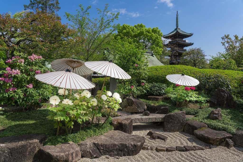 苑内からは旧寛永寺五重塔や東照宮の参道に並ぶ石灯籠や、枯山水の日本庭園とあわせて他では味わえない江戸風情の中でぼたんを楽しめます。