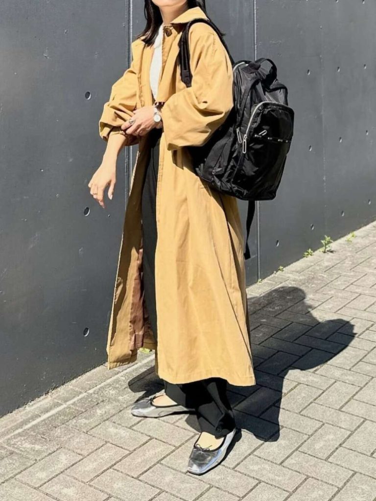 明るいカラーのトレンチコートは、羽織るだけで春めく着こなしを叶えます。黒のリュックを合わせて、スマートな印象に。