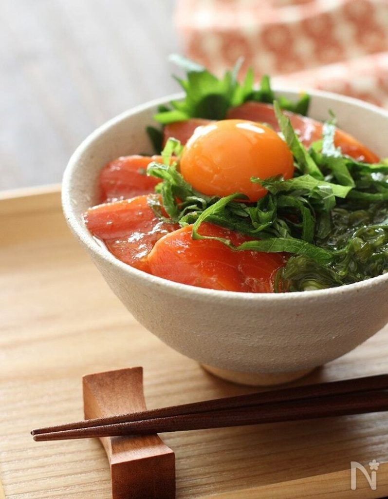 お刺身のサーモンに味を馴染ませておきます。(漬けおき時間は調理時間外です。)その後は材料をのせていくだけ。しっかりと味がついているので、ご飯との相性は抜群に良いですよ。がっつり食べたい丼レシピです。