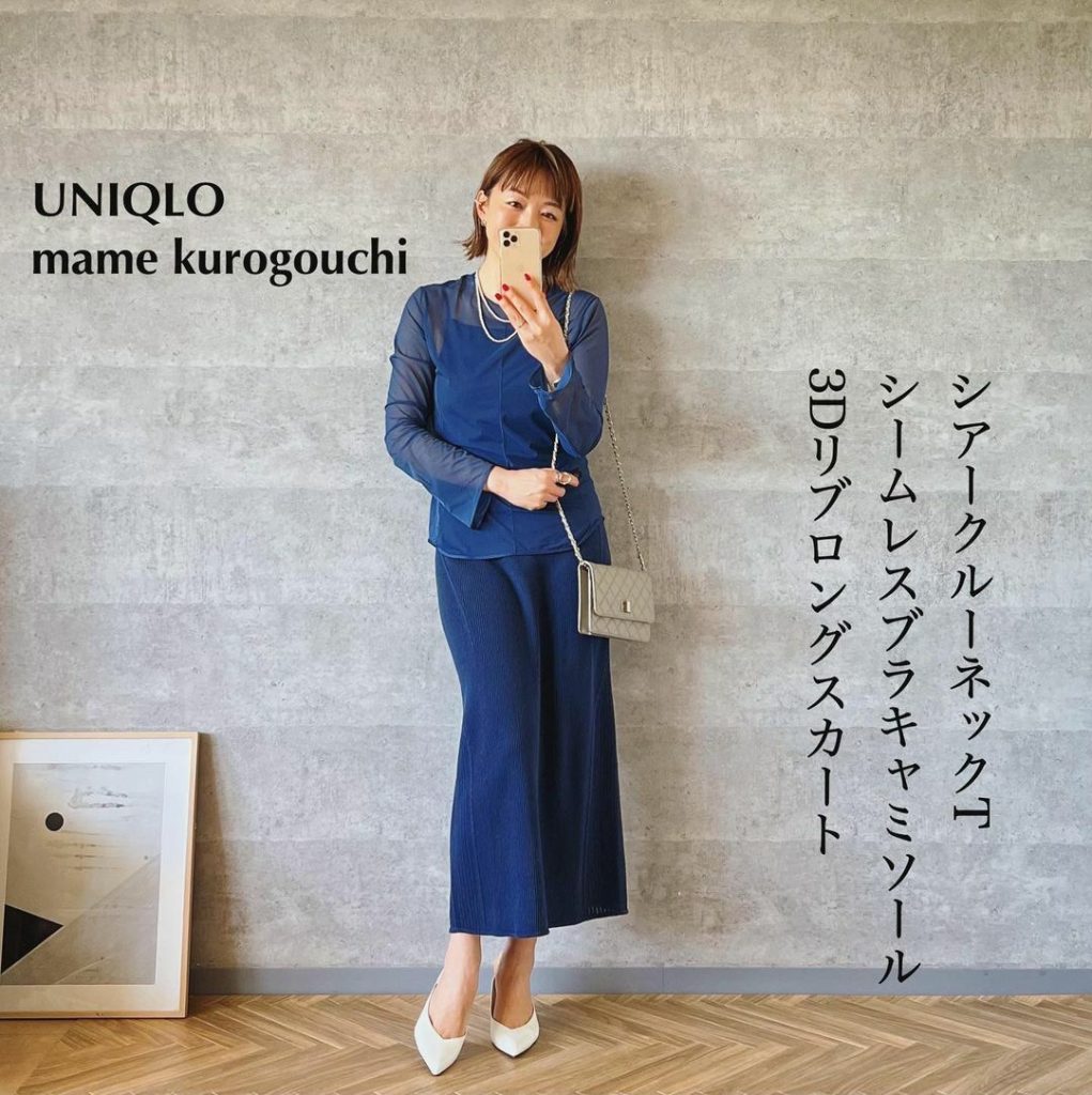 マメクロのトップスと組み合わせて、トータルコーディネートにすると、着こなしの完成度が高くなります。シアーT、ブラキャミソール、スカートを全てブルーでそろえると統一感もあって、流れるような体のラインが美しいです。