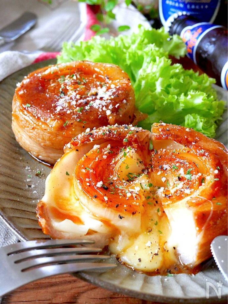 輪切りにした新玉ねぎにチーズを挟み、豚ばら肉をぐるりと巻いて照り焼きにした一品。豚肉の旨みを吸った新玉ねぎからチーズがとろりとあふれて絶品です。お好みで黒胡椒や粉チーズなどを振ってどうぞ。