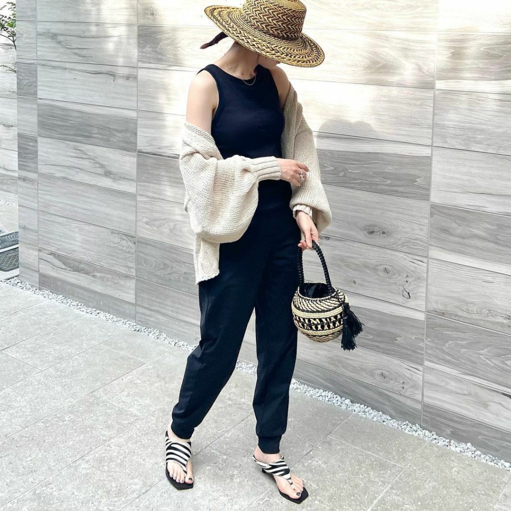 ウルトラストレッチで伸びがよいジョガーパンツは動きやすく、スポーツやレジャーなどアクティブなシーンでも活躍します。上下黒コーデにニットカーデ、麦わら帽子を合わせたコーデはリゾート感たっぷりです。