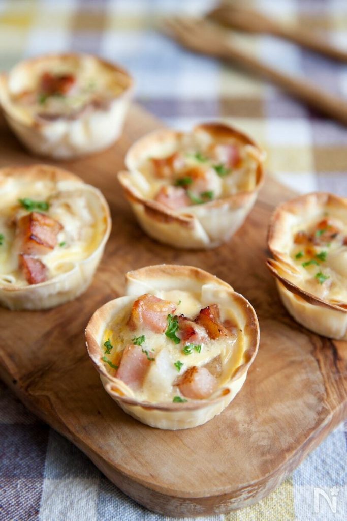 餃子の皮をカップにして作ったれんこんとベーコンのキッシュです。一人分サイズなので持ち寄りランチなどにも良いですね。レンコンのシャキっとした歯応えがより美味しさを引き出しています。何度も食べたくなりますよ。