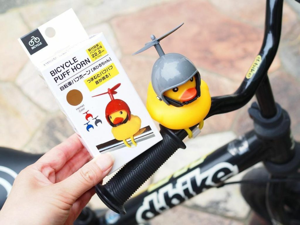 自転車のハンドルに取り付けておきたい、かわいいアヒルちゃんがいます。体を押すとパフパフと音が出るので、ベル代わりに使えますよ。自転車を走らせると、あひるちゃんがかぶっているヘルメットのプロペラが回るのもかわいいです。