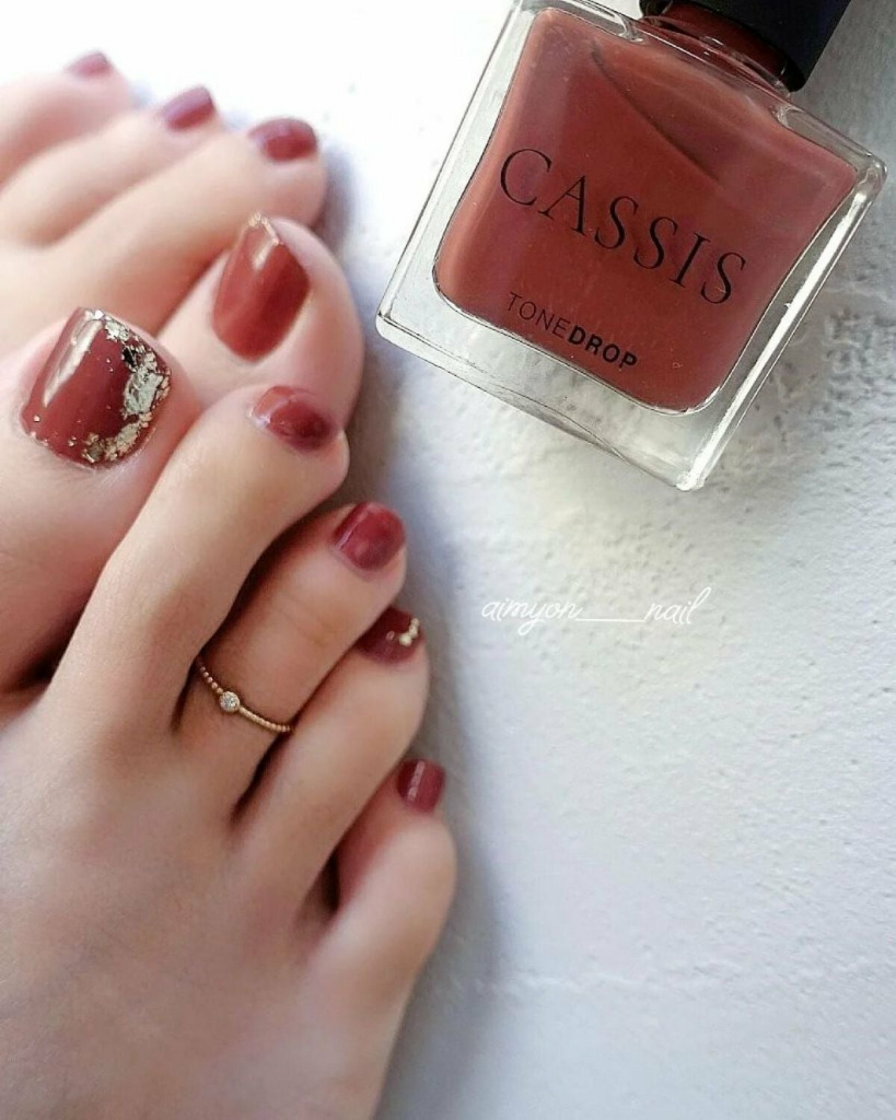 フットネイルと言えば「赤」!という方も少なくないと思います。そんな方には少し変化球な「赤」を推したいんです。光の加減でも表情の変わる、レディなくすみカラー。華やかだけど上品さも欲張りたいときに、手に取ってみてください。