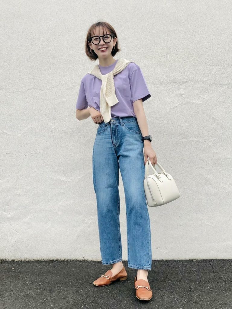 インナーにエアリズムのタンクトップを着れば、シアーTの透け感がきれいに活かせます。デニムあわせで、濃淡をつけて着こなしにメリハリを加えて。