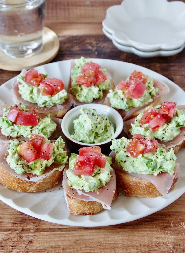 アボカドとクリームチーズのディップは濃厚で、バゲットによく合います。生ハムでうまみをプラスし、トマトでフレッシュさと彩りもアップ。サンドイッチ感覚で食べられます。クラッカーで作るのもありです。