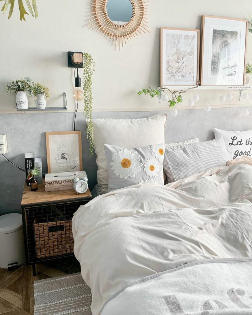 ベッドルームでひときわ目を惹くのが、デイジーの花の刺繍がかわいいクッションカバー。見える場所に置くだけで、ときめく部屋のできあがりです。手洗いでお手入れできて、清潔に使い続けられますよ。