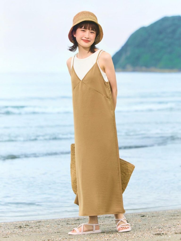 VネックとIラインシルエットで、全身をすらりと見せるワンピース。合わせるトップスによって表情が変わります。ブラウンのワンピには、白のタンクトップを爽やかにレイヤード。ナチュラル素材の小物でリゾートライクに着こなして。