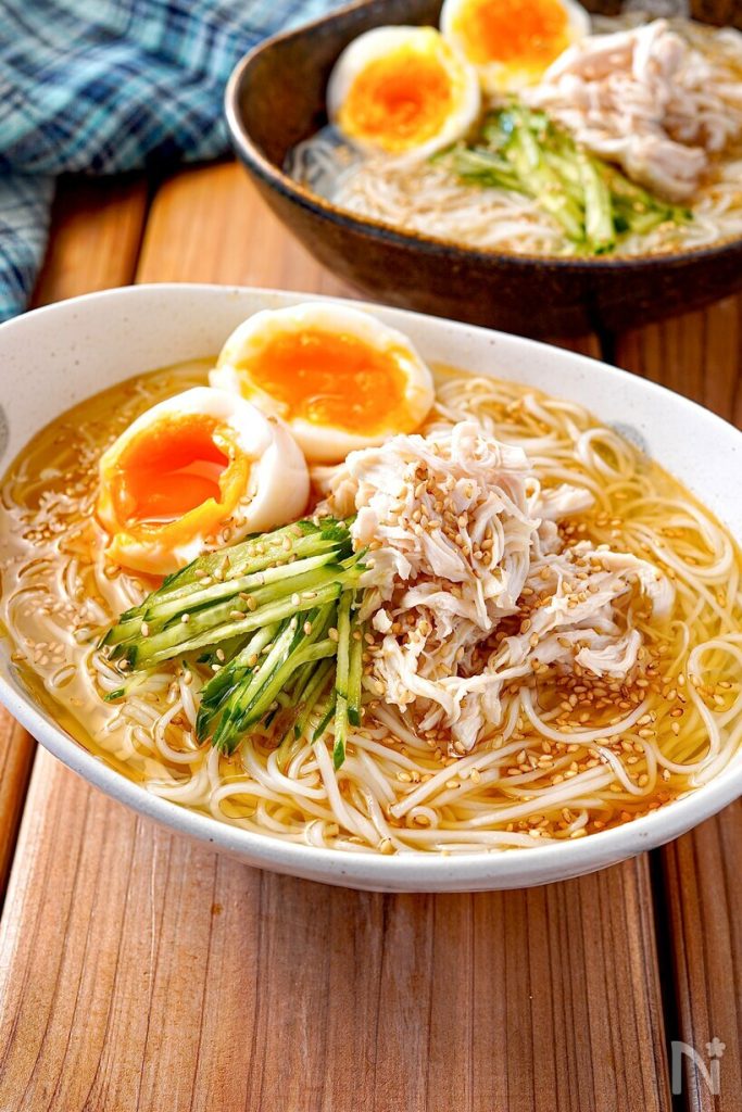 きゅうりやゆで卵、レンチン蒸し鶏をトッピングし、さっぱり鶏だしベースの冷製スープをかけていただく、ボリューム満点なそうめんです。10分ほどで作れるお手軽さも嬉しいポイント。