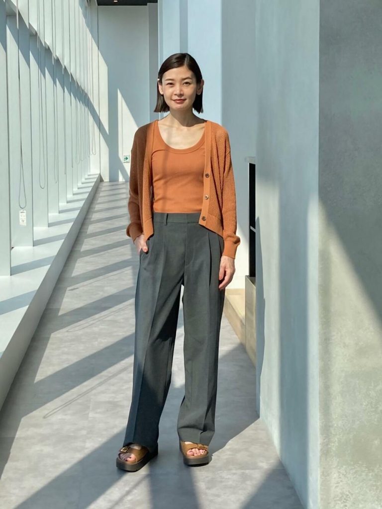 透け感たっぷりのメッシュニットの重ね着インナーにもブラトップが活躍!ベージュのニットにはパンツもベージュにして、ブラウンのタンクトップを重ね着すれば秋を予感させるワントーンコーデに。色で季節感を先取りしています。