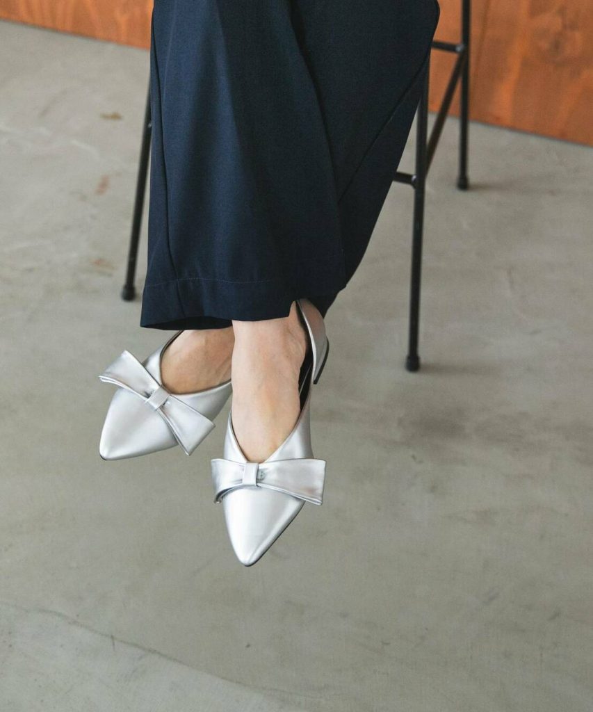 それならリボンがついたフェミニンなデザインのパンプスを、シルバーでチョイス。今っぽさ満点で、一気に旬コーデが完成です。
