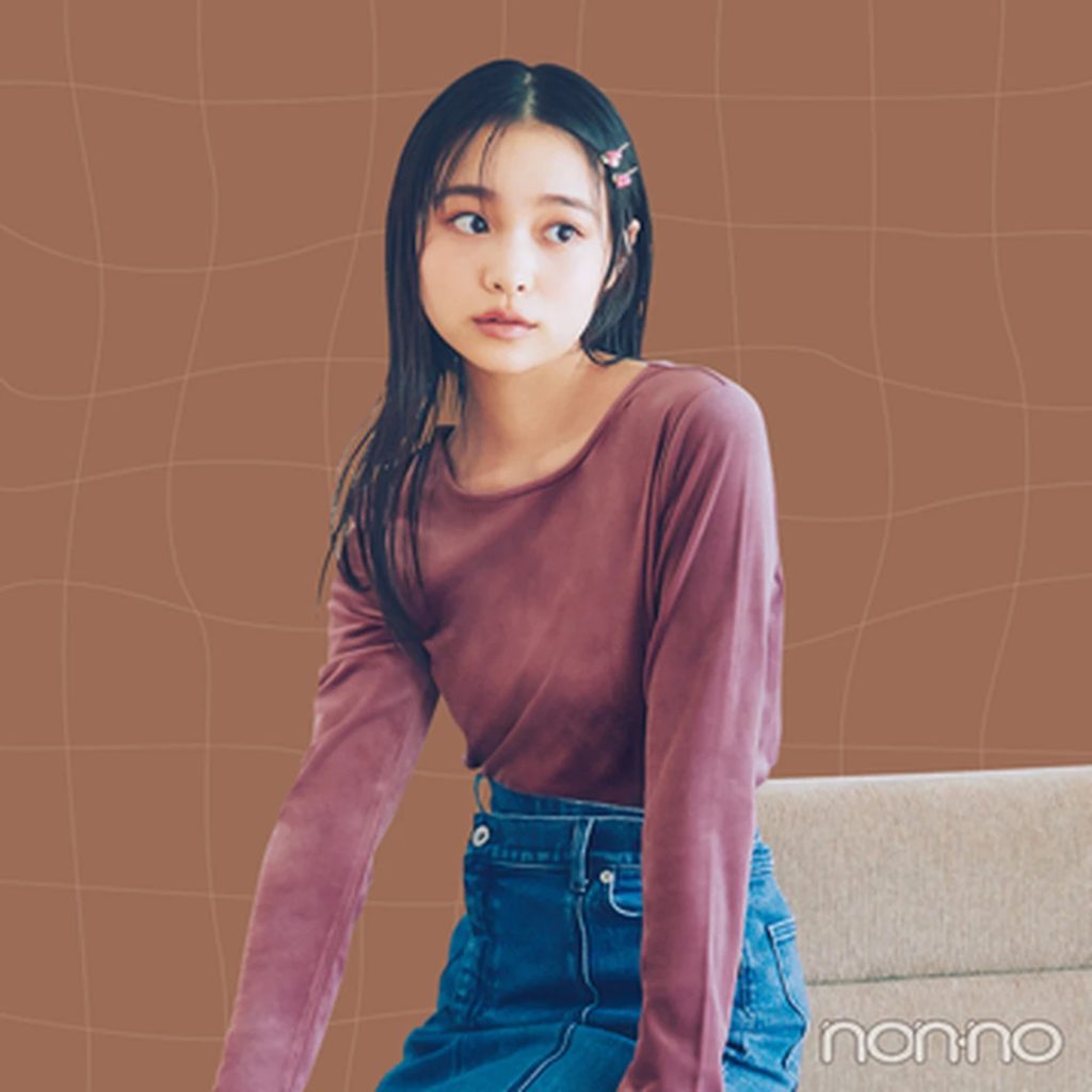 この秋はロンT感覚でベロアトップスをコーデに投入。シンプルな形だからどんなボトムにも合う♡ フロントスリット入りのデニムロンスカで媚びない女っぽさをアピールして。