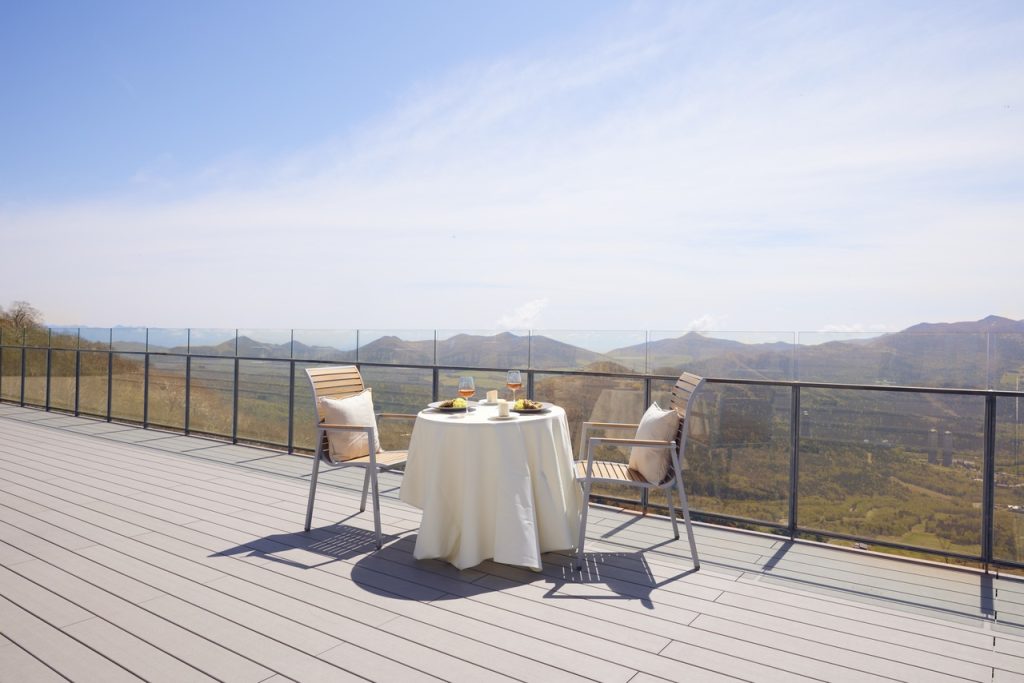 ランチを楽しむ場所は、眼下に広がる黄葉を一望できる標高1088mに位置する特等席です。秋が深まるにつれて緑から黄色へと色を変える白樺の葉が織りなす景色や、雄大な日高山脈を眺めながら、自然を感じられます。