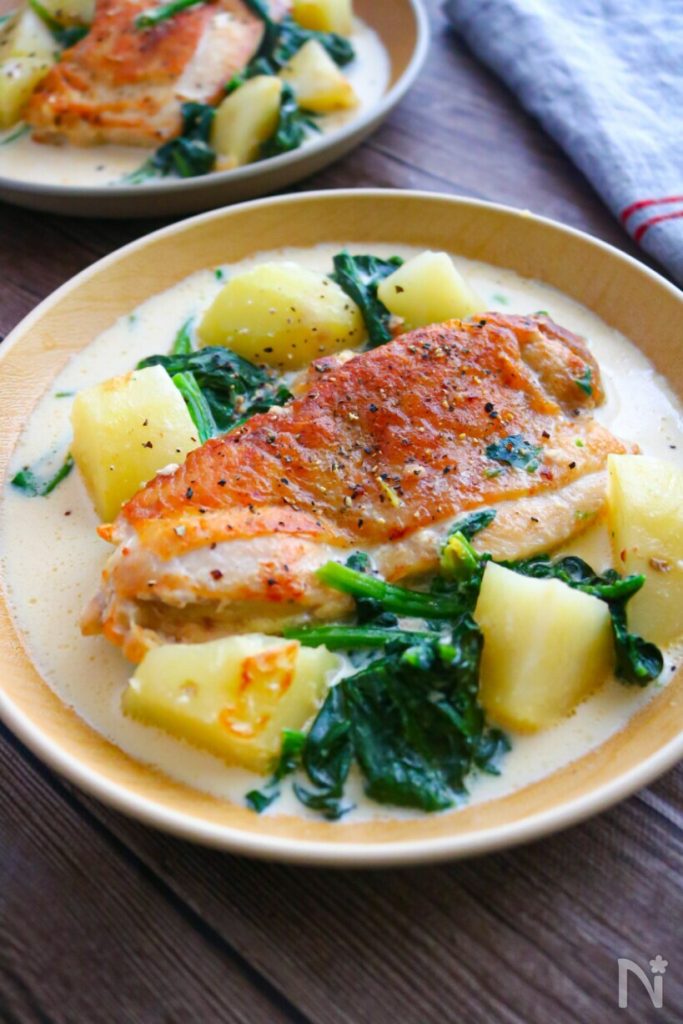 【鮭とほうれん草の和風クリーム煮】簡単なのに絶品!お魚レシピ | レシピサイトNadia