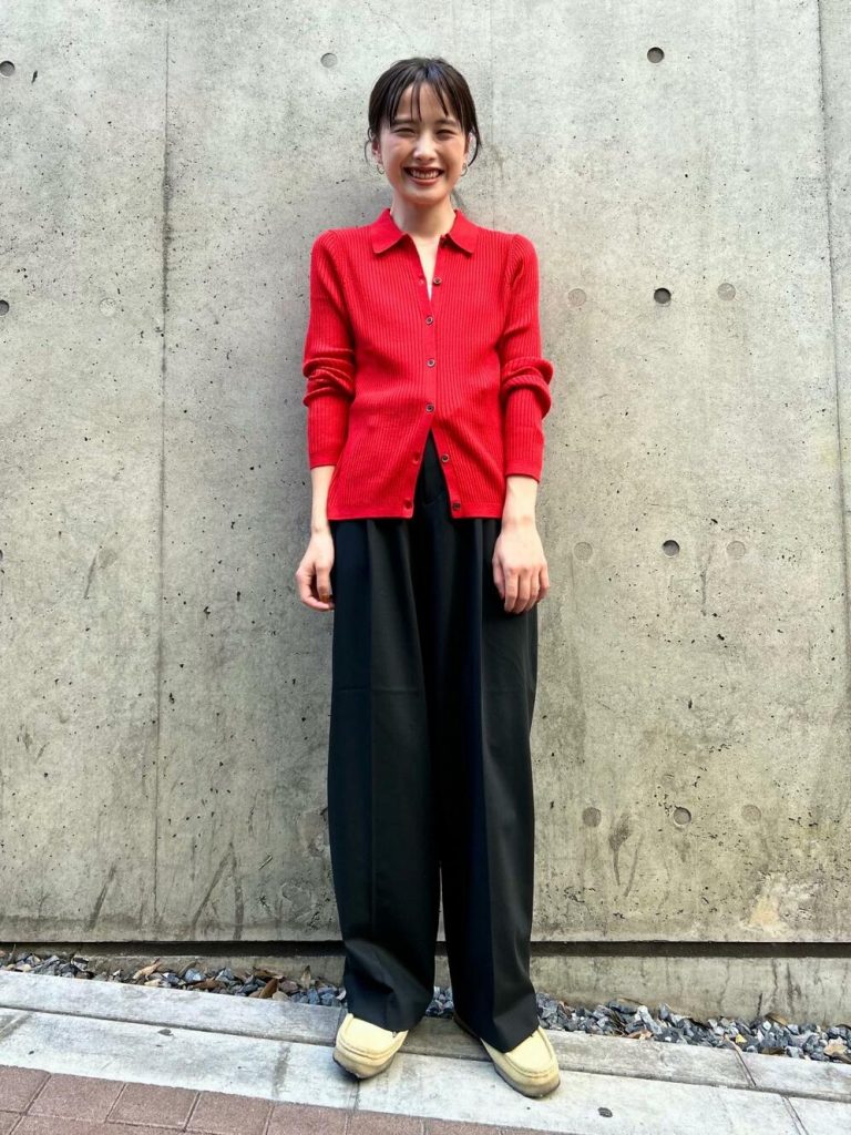 きれいな赤と襟付きのポロカーデというデザインがマッチして、店舗でもオンラインでも大人気の赤ニットです。