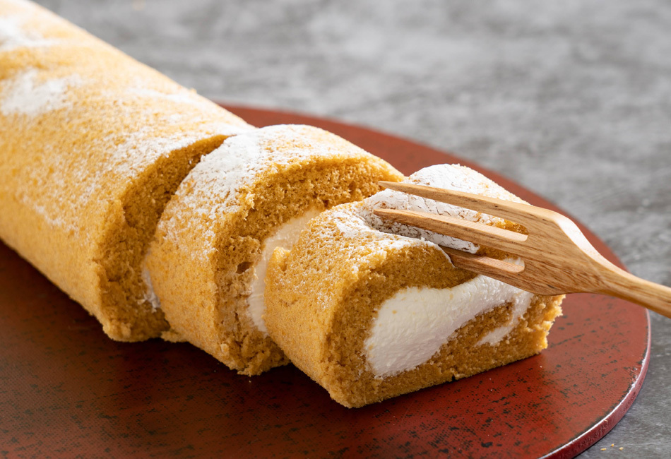 「和三盆手巻き」は、2000年にデビューして以来、現在も進化し続ける、お店の代表的なケーキの1つです。生地に、香川・讚岐で古くから伝統製法で作られてきた「和三盆糖」の原料糖である「白下糖(しろしたとう)」を使っていて、茶褐色の見た目は、この「白下糖」の色に由来しています。