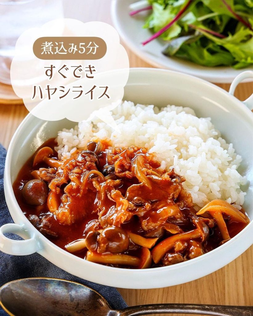 煮込む時間はたったの5分、時短で作れるハヤシライス。きのこや玉ねぎなど野菜がたっぷりと入っています。ルーやトマト缶は使わず、ケチャップや中濃ソースなどの調味料で作れるのも簡単なポイントです。