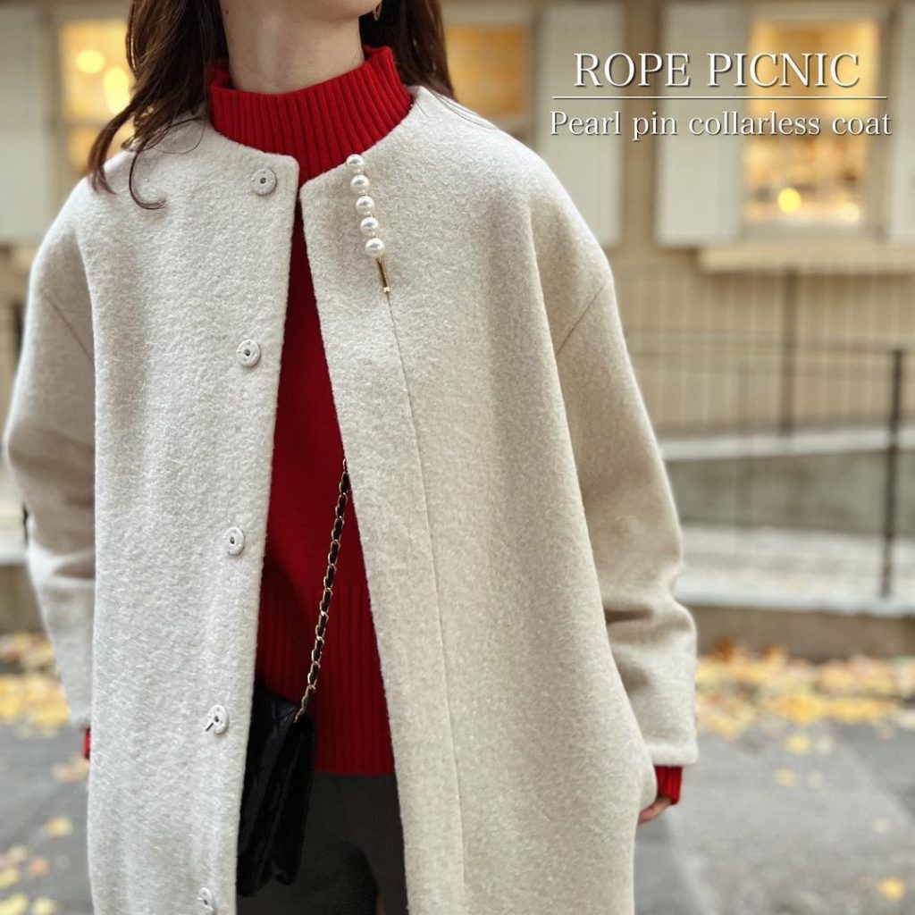 首元にパールピンがついて、表情が華やかに見えるロングコート。Iラインシルエットでスタイルアップも狙えます。ノーカラーなのでハイネックのトップスも合わせやすいです。赤ニット×オフホワイトでクリスマスカラーの装いに。