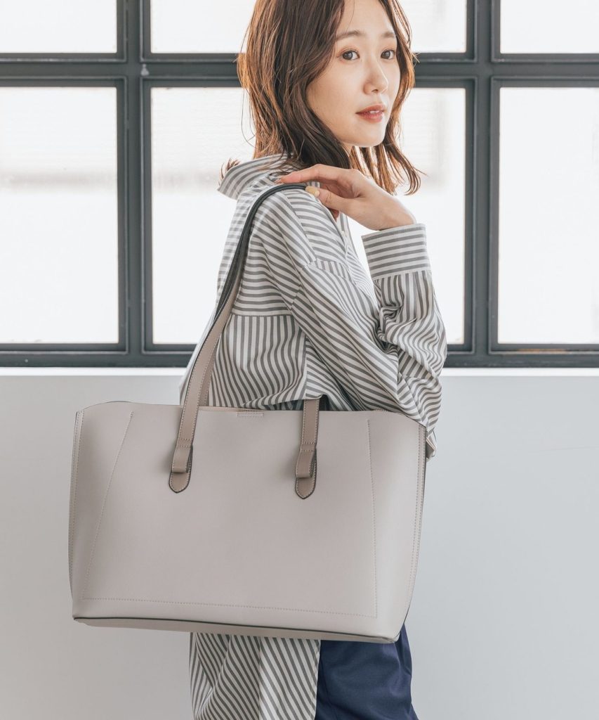 長さの異なる2種類のハンドル付きなので、2通りの持ち方ができるのも魅力です。スリムな見た目ながらマチが広く、収納力もばっちり。