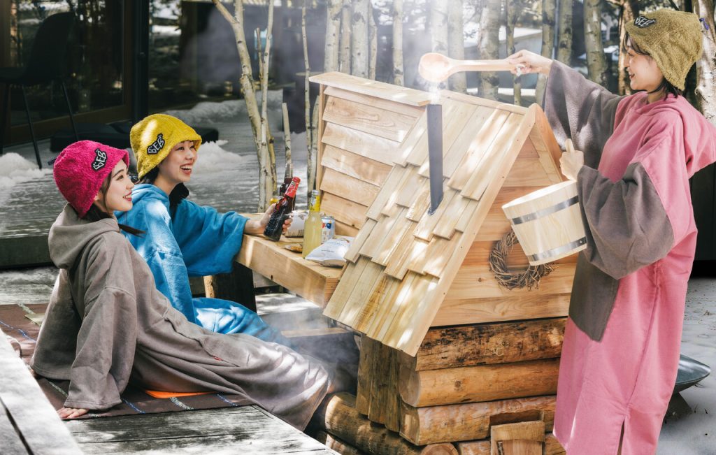 BEB5軽井沢ではサウナに⼊りながら、ゲームや⾷事などを⼀緒にできるよう、⾜だけサウナをオリジナルで作成しました。仲間とおしゃべりしながら、ロウリュや軽井沢の冬の外気浴も⼿軽に体験できます。