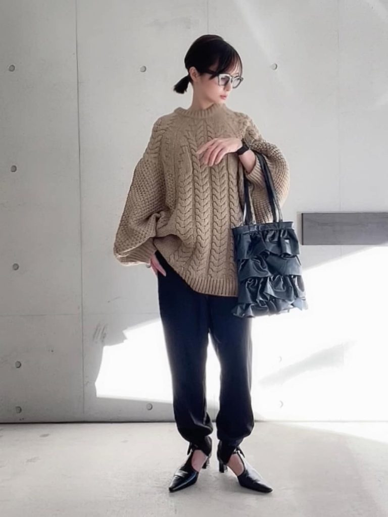 ビッグシルエットのニットが持つゆるっとしたリラクシーさとは大局的なヒールとのスタイリングが、とってもハイセンス。