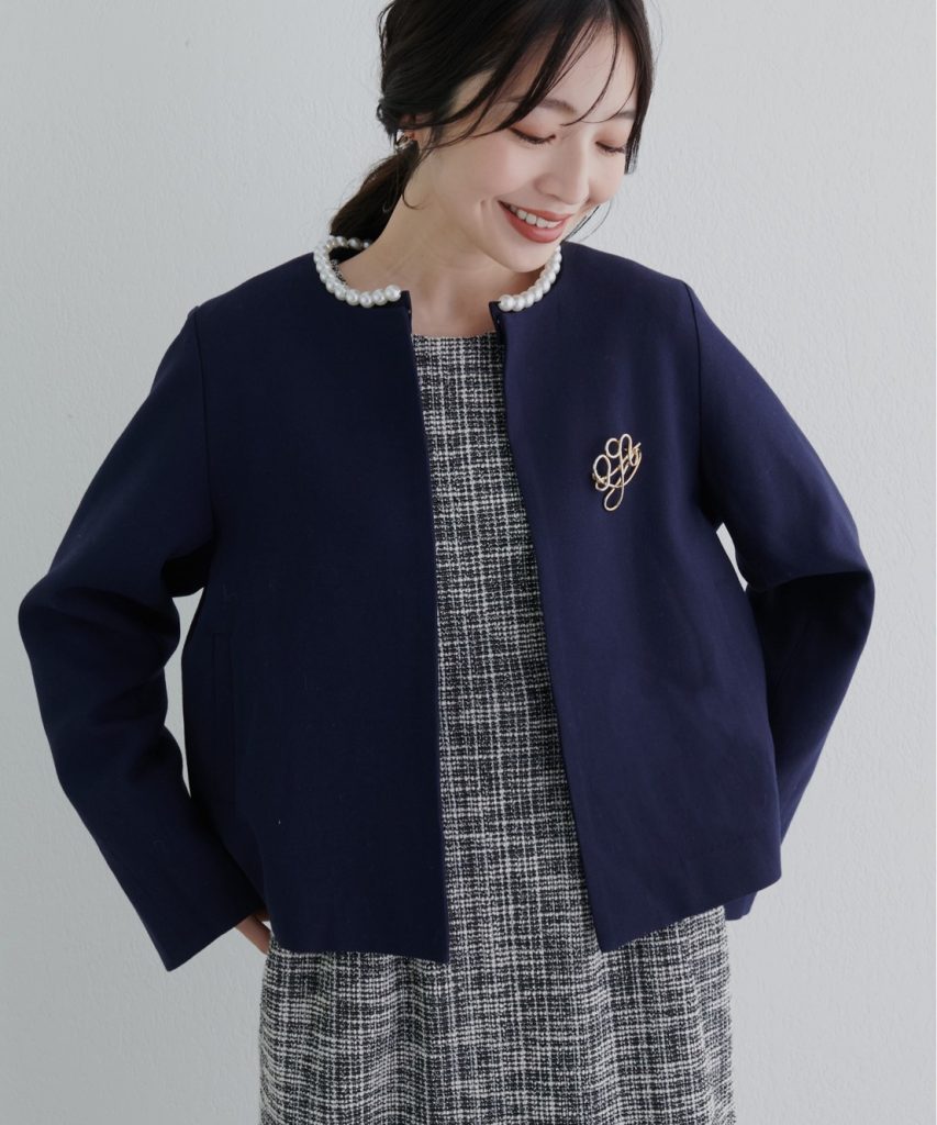 羽織るだけでセレモニーコーデがしっかり華やぐ、パールネックのノーカラージャケット。