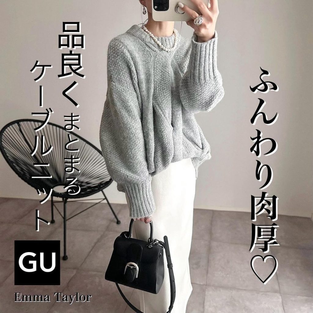 ふんわりした肉厚のグレーニットにスカートを合わせたキレイめスタイル。クール系に傾きやすいグレーの着こなしですが、淡いトーンのグレーと白を組み合わればぐっとフェミニンな印象に。