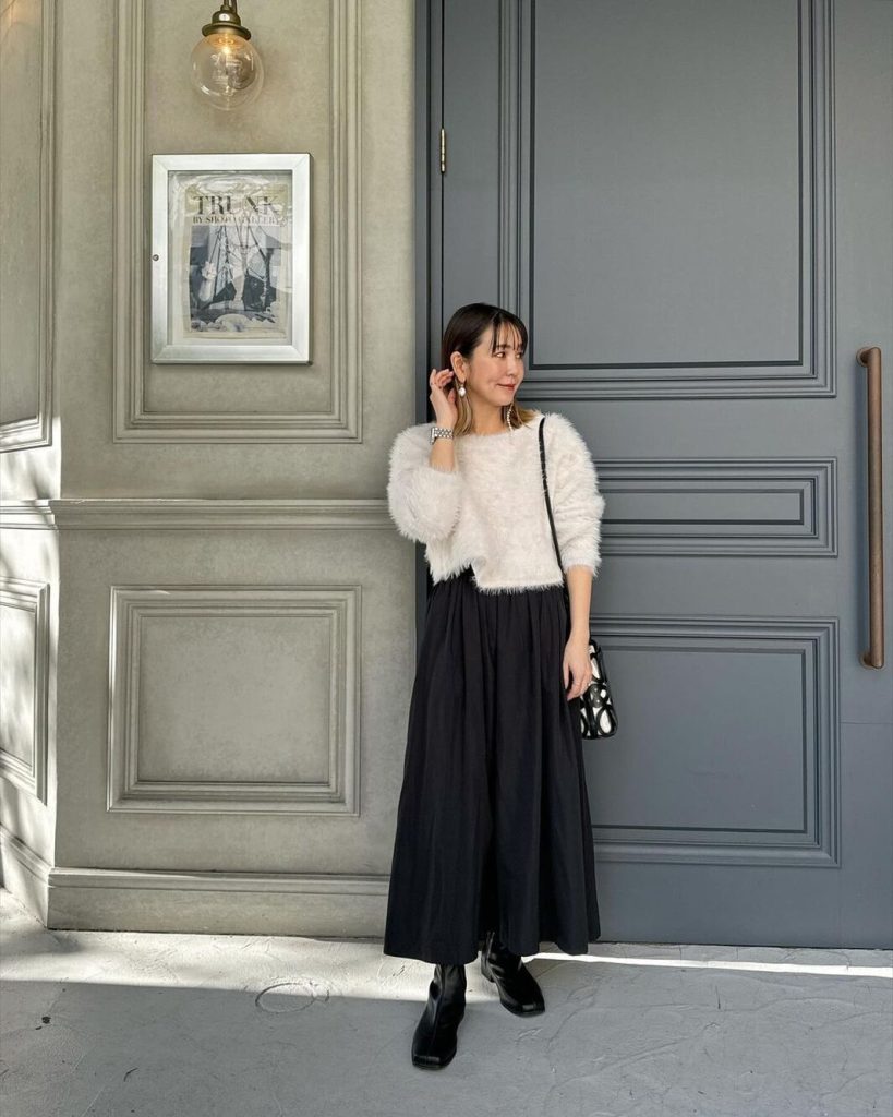 シンプルで使い勝手の良い黒色のフレアスカートは、ワードローブにあると何かと重宝します。トレンドのシャギーニットを合わせれば、旬のムード溢れるスタイルの完成です。