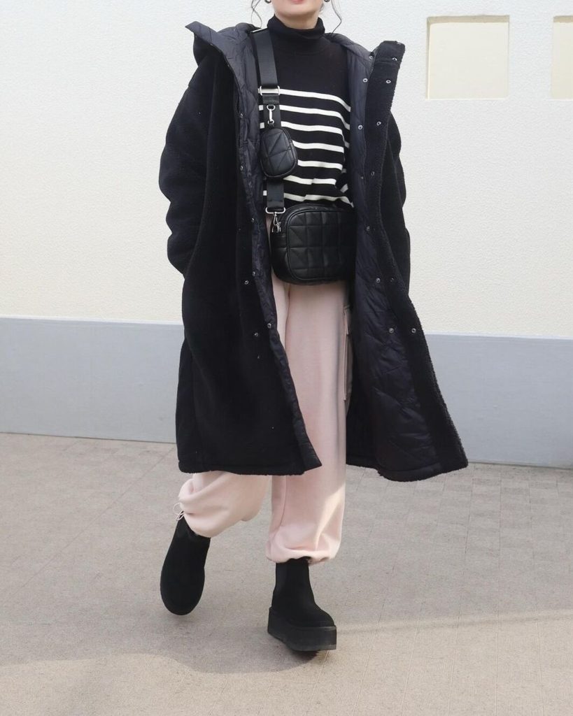 ブーツの中にスウェットパンツの裾をクシュっと入れれば、今っぽさも暖かさも一度に手に入りますよ。