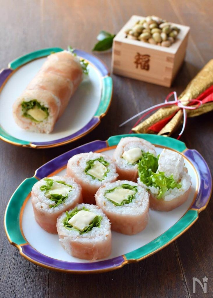 生ハムの程よい塩味と濃厚なカマンベールチーズがマッチした、おつまみにもなっちゃう恵方巻きです。ピンク色のビジュアルが可愛らしくテーブルを華やかにしてくれますよ。お酒と一緒に楽しみたいですね。