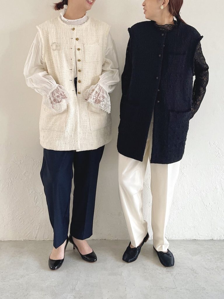 シンプルなデザインなので、カジュアルなアイテムとの相性も抜群。インナーが違うと同じジレとは思えないですよね。気になる腰回りをカバーしてくれるので、タイトなシルエットのインナーも安心です。