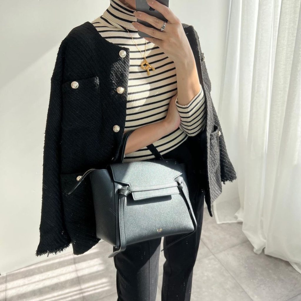 ニットセットアップを軸に小物は黒で統一。甘さのある白のニットセットアップも、キレイめな小物を合わせることで大人バランスに。