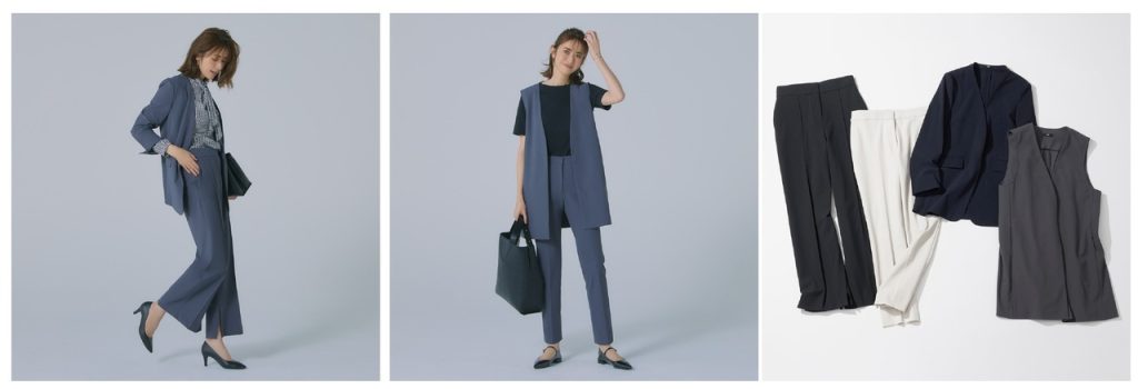 (写真左から) ハイストレッチトリコットカラーレスジャケット 20,000円(税込) ハイストレッチトリコットノーカラーミドルジレ 17,000円(税込) ハイストレッチトリコットスリットストレートパンツ 12,000円(税込) ハイストレッチトリコットスティックパンツ 11,000円(税込)