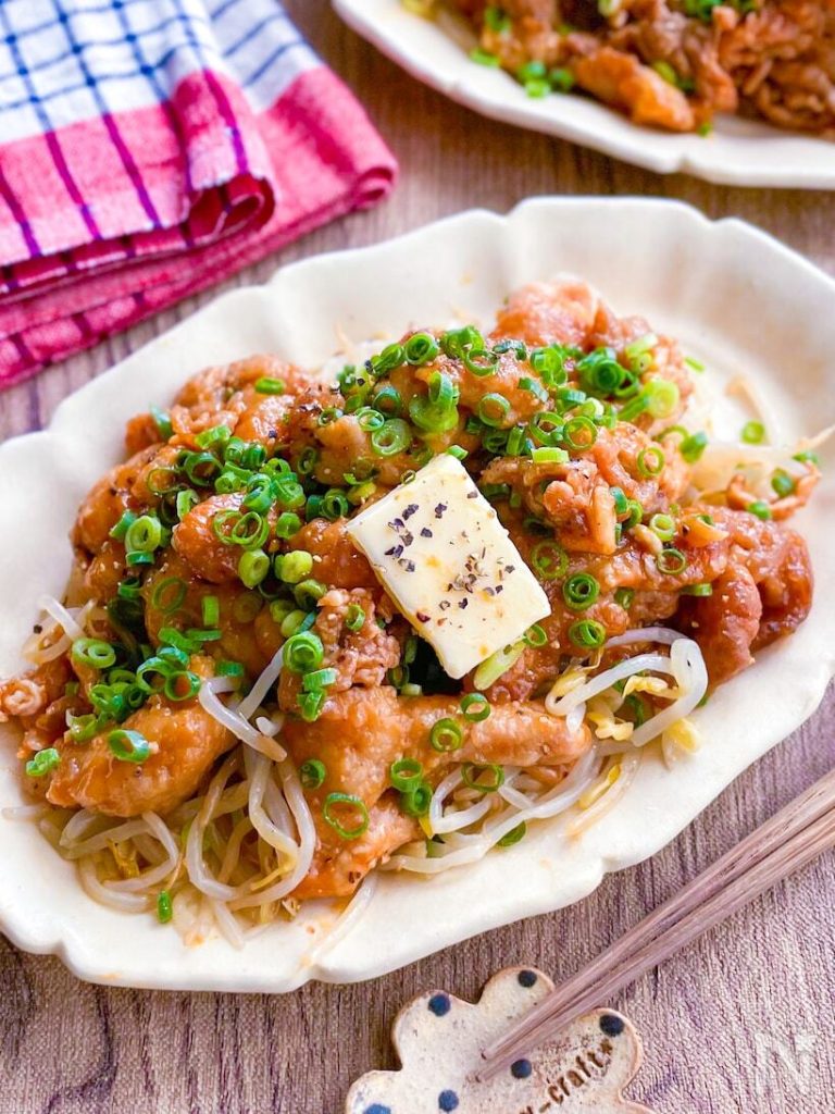 豚こま肉ともやしだけで、がっつり旨辛いスタミナ満点おかずが作れます。野菜をたくさん買い揃えるのが面倒な日におすすめ。仕上げにバターを乗せ、ねぎと黒胡椒をたっぷりかけてお召し上がりください。