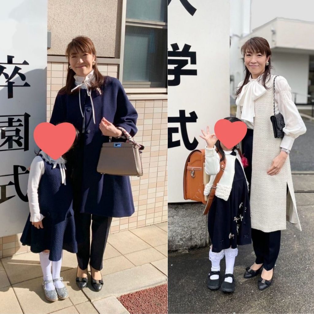 「卒園式は周りのママたちの意見を参考にしてネイビーのフォーマルスーツを着ました。その後すぐに引っ越したので同じ小学校に入学する子はおらず、卒園式に着たスーツで行くことも考えましたが、VERYの卒入園の記事を読んで、入学式はやはり新しい門出に似合う明るいカラーで行きたいなと思い、白で行くことにしました。色が違えば同じアイテムを使っても同じコーデには見えないので、あとから写真を見てもこれどっちの式だっけ?と思うことはありません」飯田綾子さん・36歳(7歳の男の子と4歳の女の子ママ)