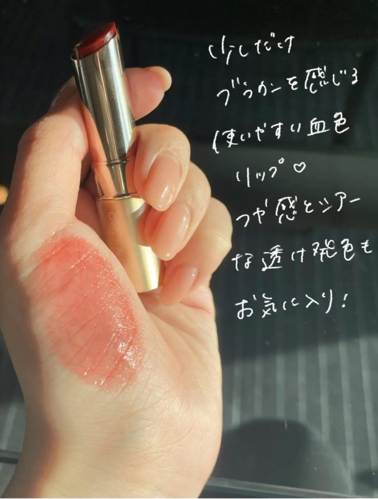 ヌーディーな赤っぽい色味が大人っぽく、透き通るような光沢感がみずみずしい唇を演出します。