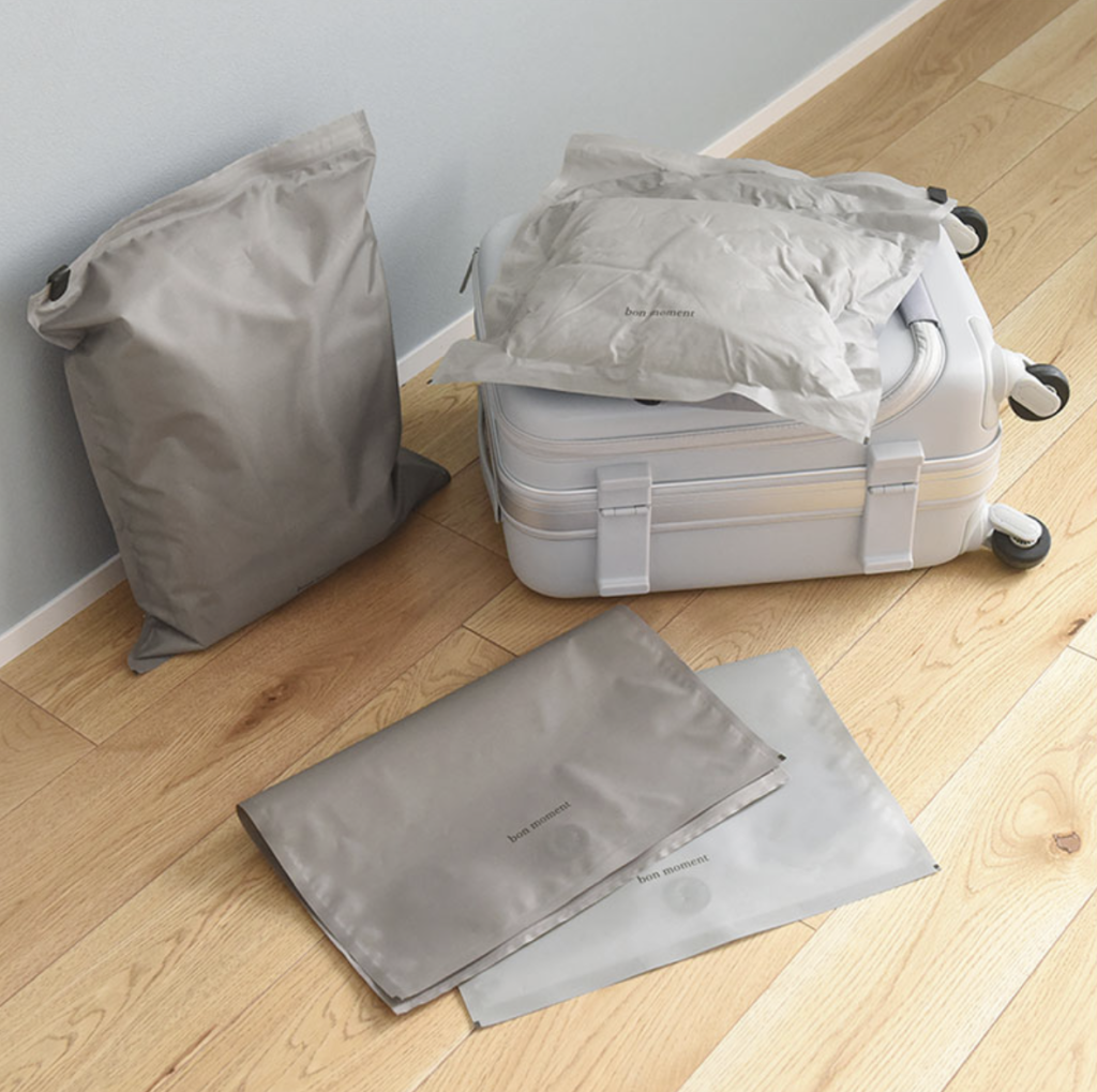 bon momentの圧縮袋は、排気バルブ付きで空気がスピーディーに抜けるうえに、まるで布地のような高級感のある素材で繰り返し使える優れもの。その凄さをご紹介します。