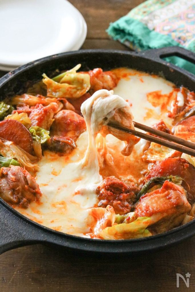 韓国のメインメニューで人気がある「チーズタッカルビ」。溢れんばかりのチーズがたまりません。〆にはご飯と卵を加えて、最後まで甘辛うまいを召し上がれ♡