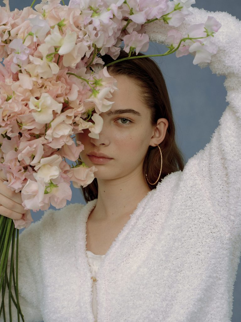 伸縮性のあるリブカットソー素材のセットアップは着心地が楽ちんです。どちらも可憐な桜の花を散りばめています。配色のメロウステッチと刺繍がフェミニンなアクセントに。