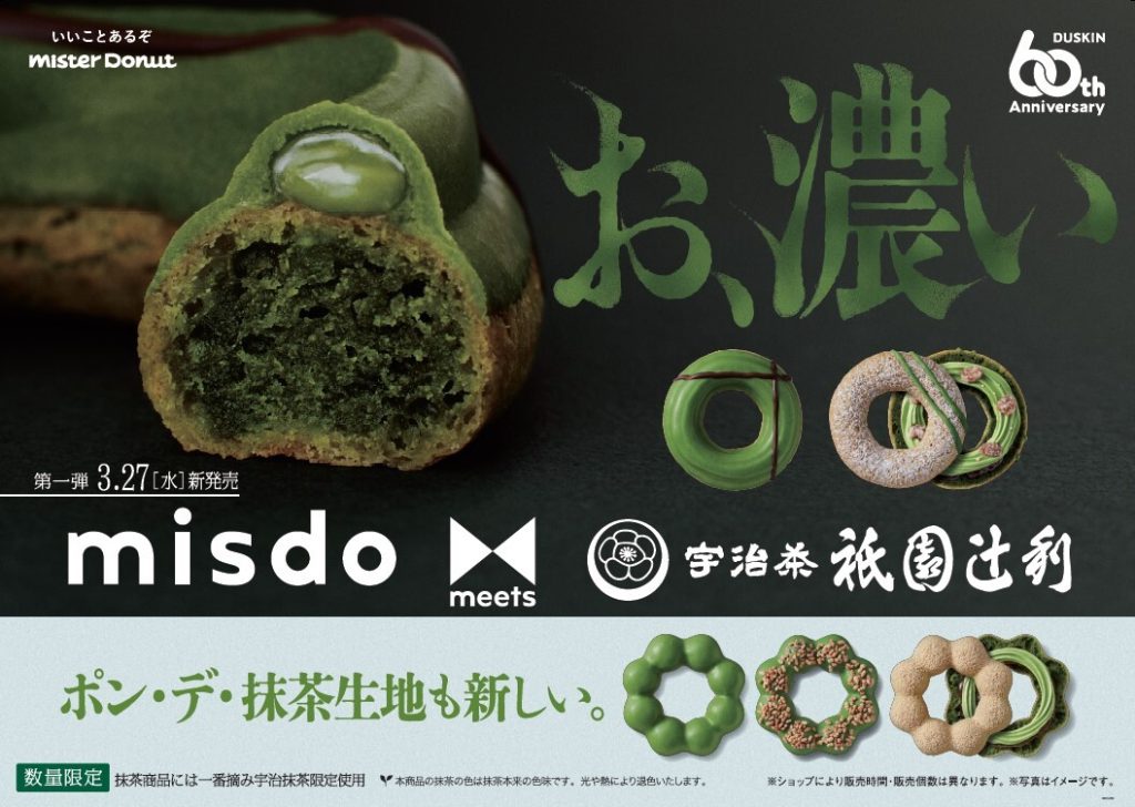 ミスタードーナツは、今年の春も宇治茶専門店「祇園辻利」とのコラボが販売されます。3月27日(水)から、共同開発した『misdo meets 祇園辻利 第一弾』全5種を期間限定で発売です。