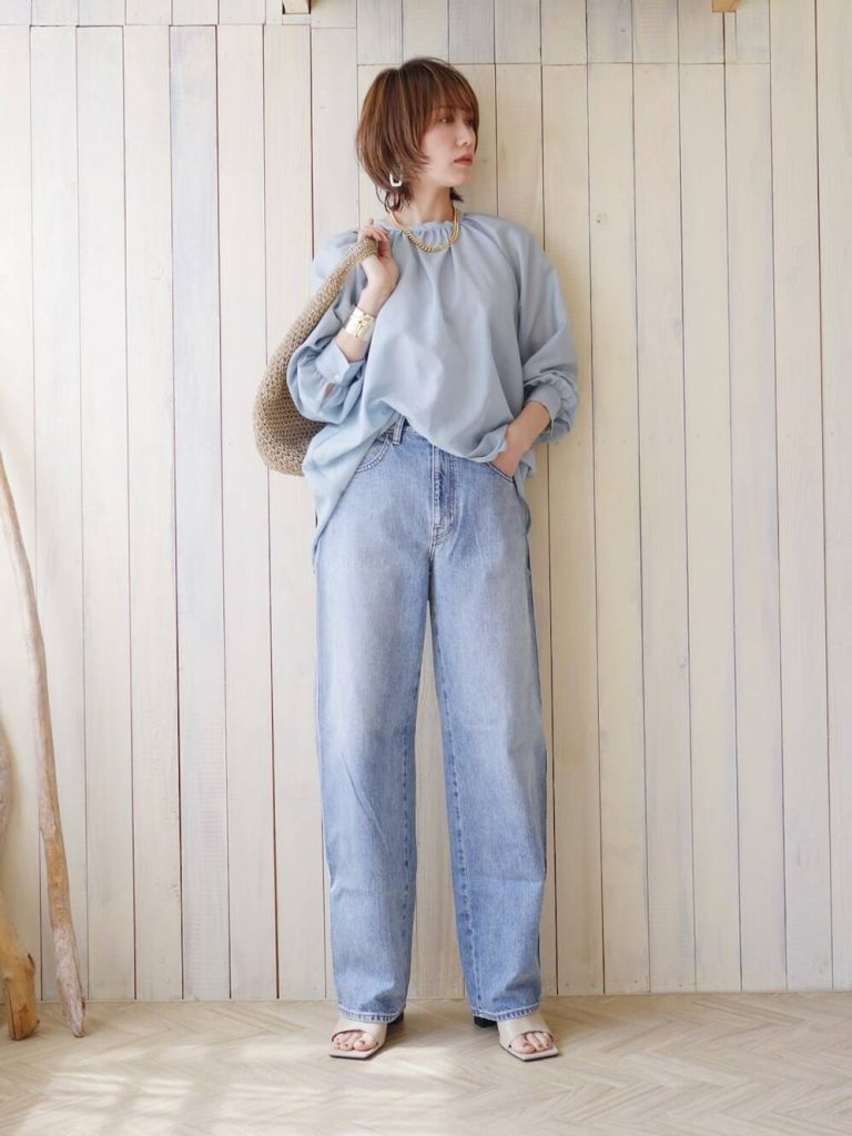 トップス&デニムを淡いブルーで統一した、春らしく柔らかな印象のコーディネート。ボリュームのあるアクセサリーをつけてメリハリを出し、より洗練されたワンカラーコーデに。
