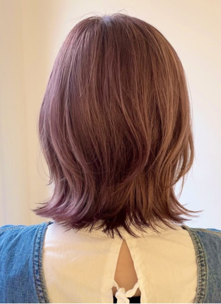 小顔見せも叶えるくびれボブは、大人世代にも人気のボブスタイルです。肩上ラインのプツっとボブに表面はレイヤーを入れたデザインです。カラーはピンクとバイオレットを混ぜた春にピッタリな色味です。