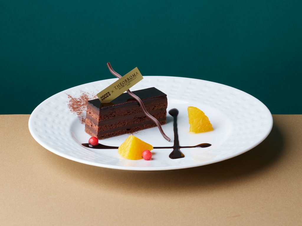 フローラルなショコラを使用したガナッシュと生地の層が織りなす、香り高いチョコレートケーキ。厳選した2種のチョコレートをブレンドし、深みのある味わいで軽やかな口当たりです。甘酸っぱいフレッシュオレンジや酸味のある赤い実スグリがショコラを引き立てます。