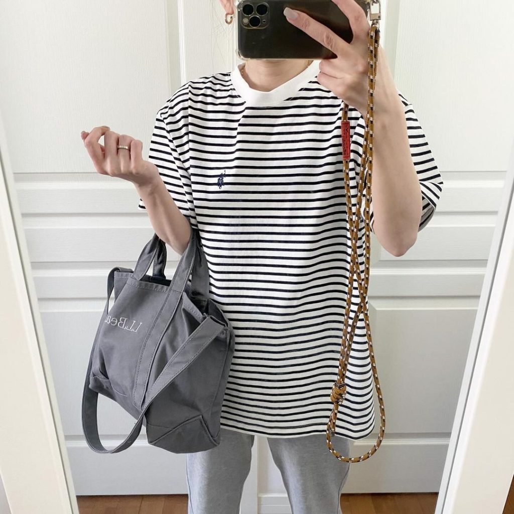 屈んだ時に胸元が見えてしまうのも避けたいところ。それなら首回りがしっかり詰まっていて、パイピングデザインのTシャツを選びましょう。