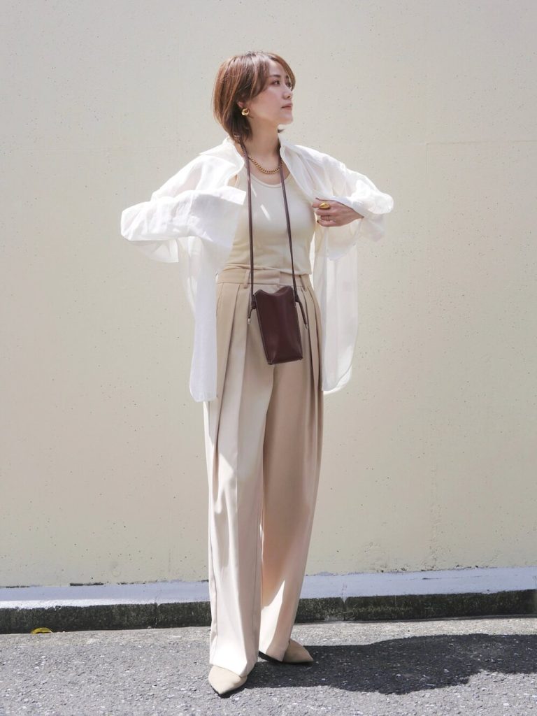 こちらは生成のシアーオーバーサイズシャツを羽織り、クリーム色のワイドパンツを合わせたリラクシーコーデ。ロング丈の着こなしには透け感をプラスして、季節感を演出しています。